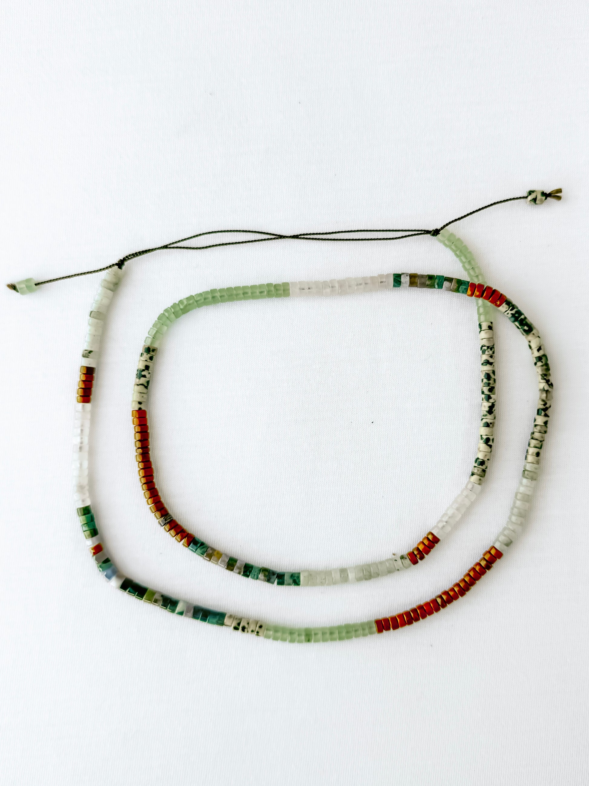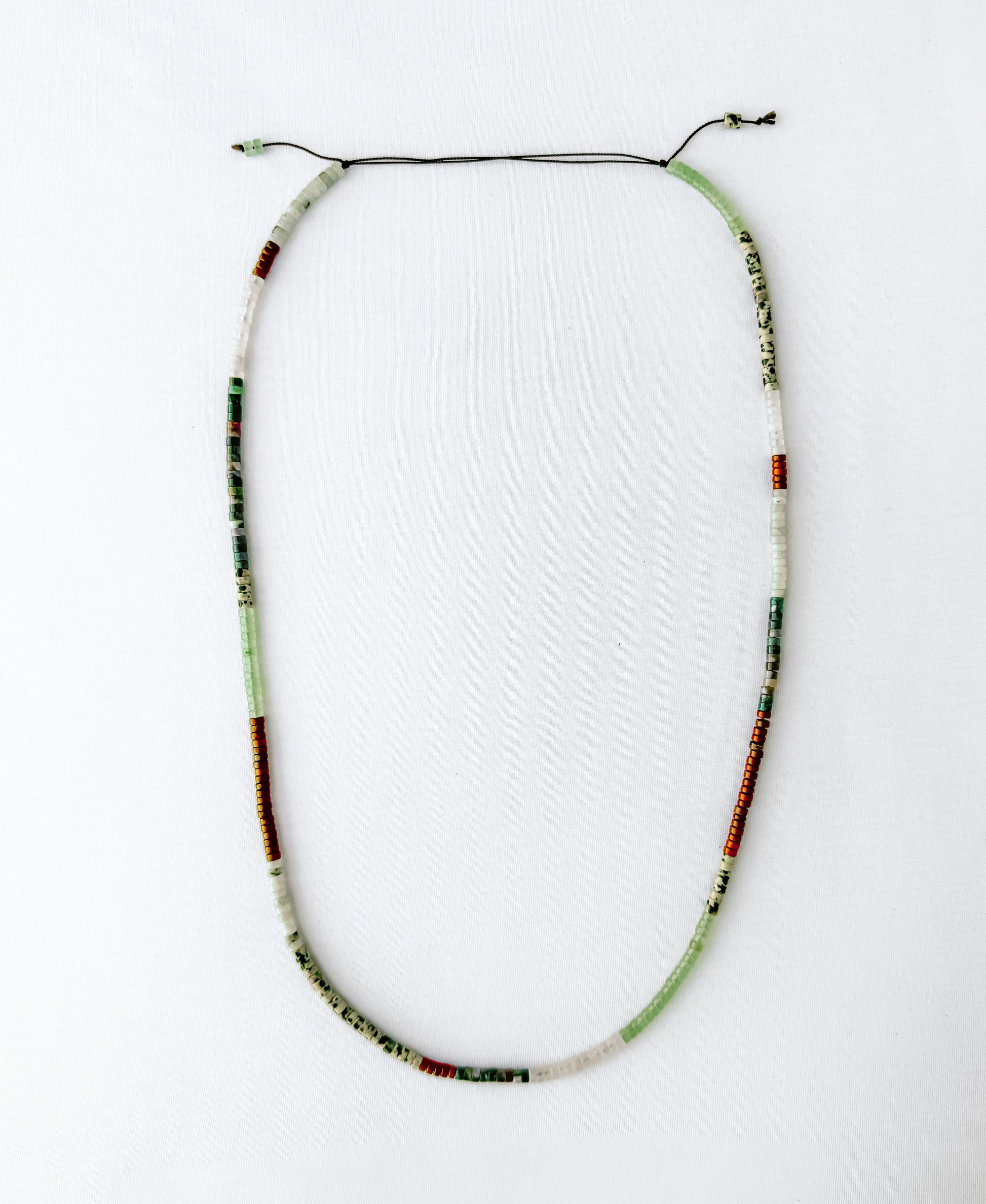 The kind of piece your aunt would have picked up on her travels in the 70s — still making the cut decades later. A muted mix of precious stone heishi beads — warm, grounded, and easy to wear, effortlessly pulling attention without asking for it.