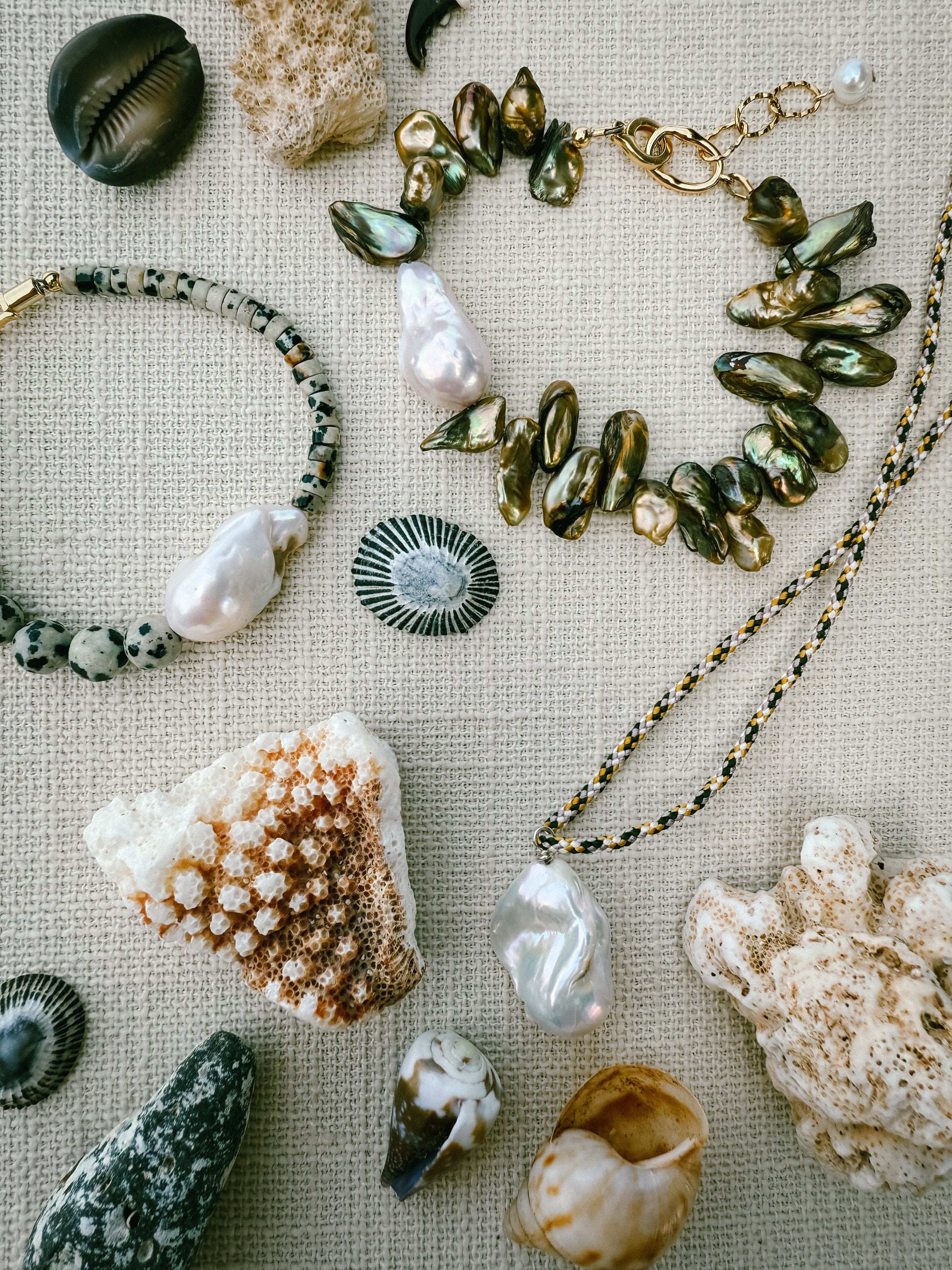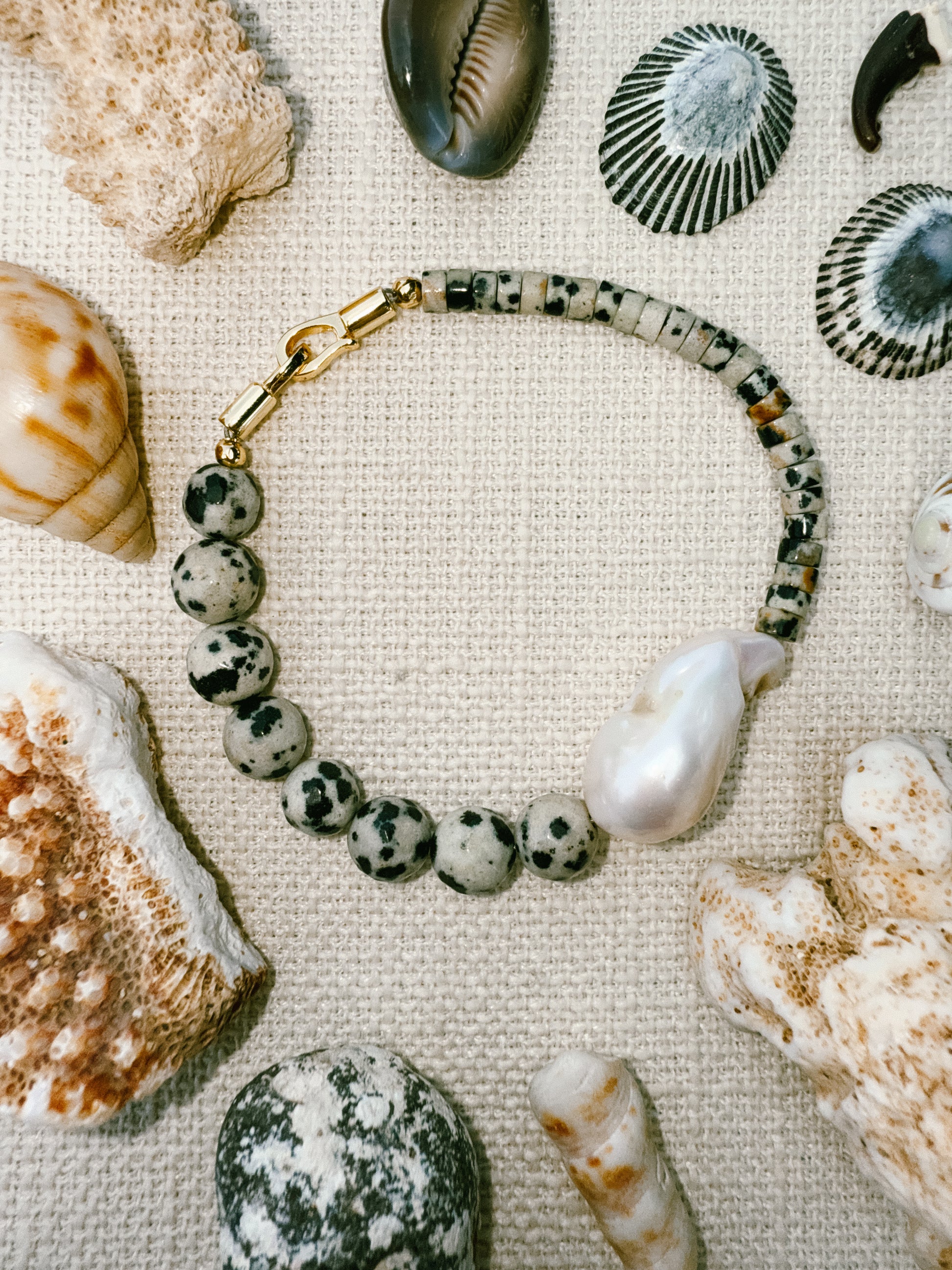 Dalmatian jasper in big & small, and a single baroque pearl. For the days you wanted a puppy, but ended up with pearls.