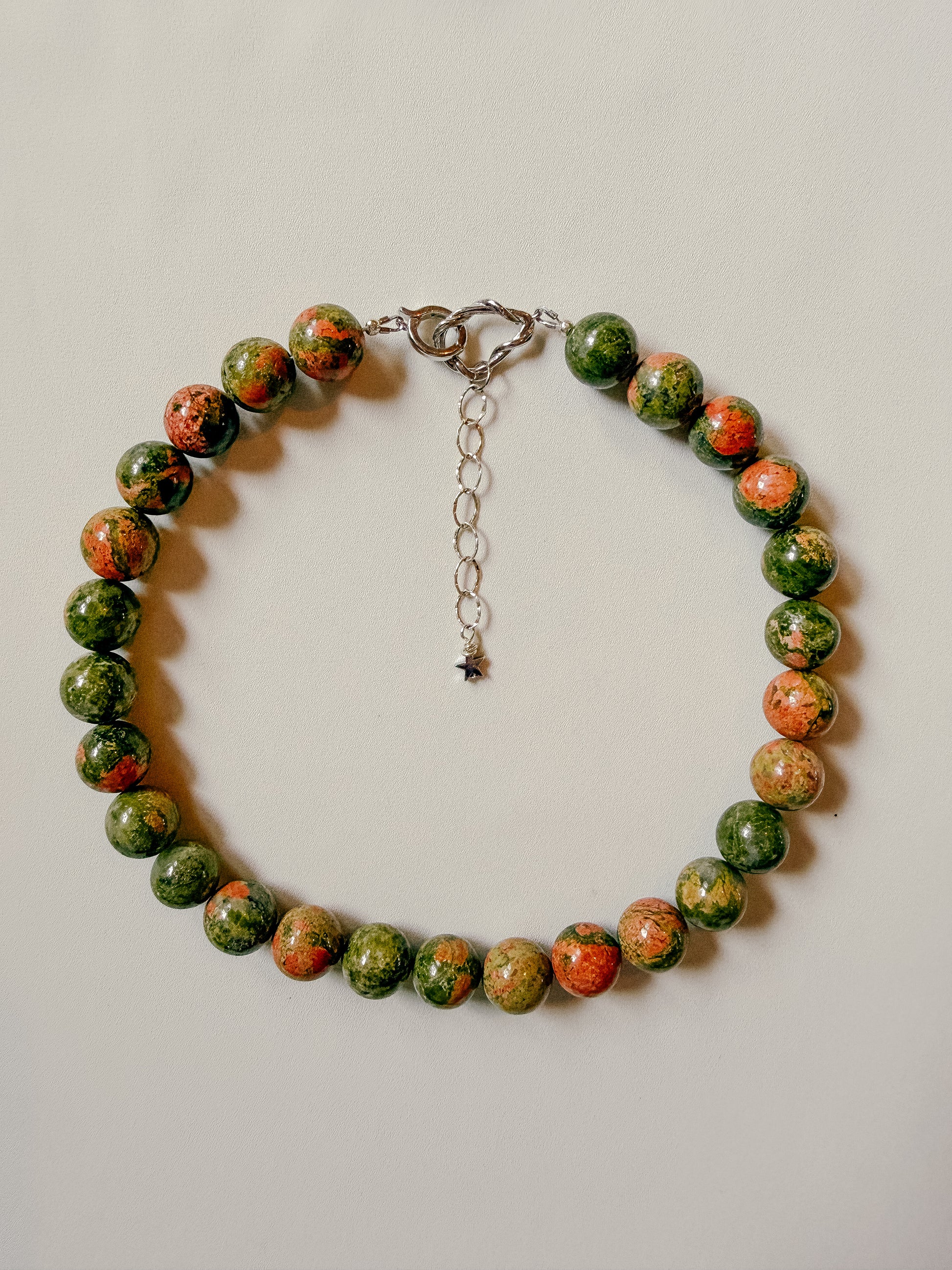 Unakite — earthy greens tangled with dusted rose. Cool, composed, and a little untamed.
