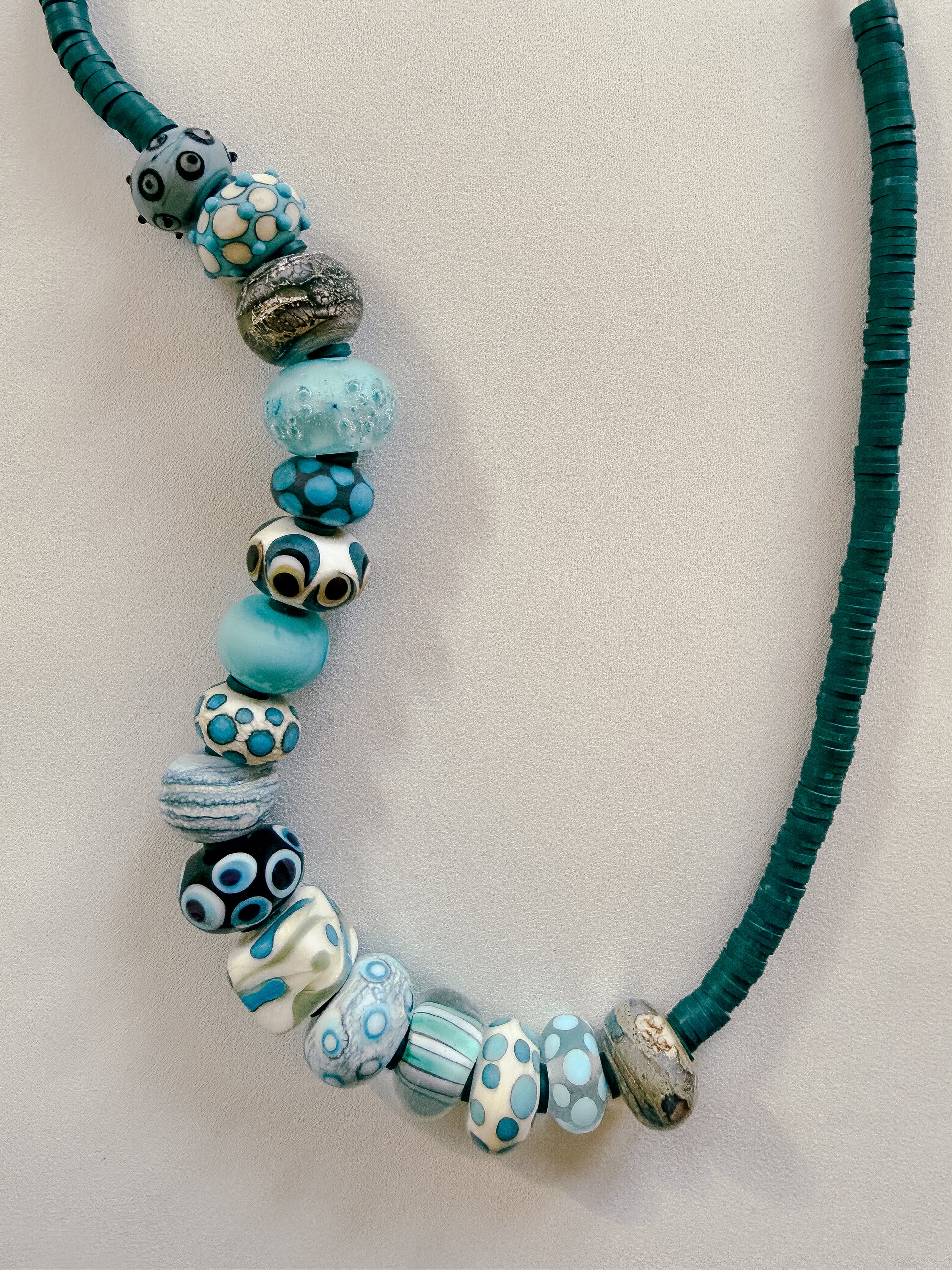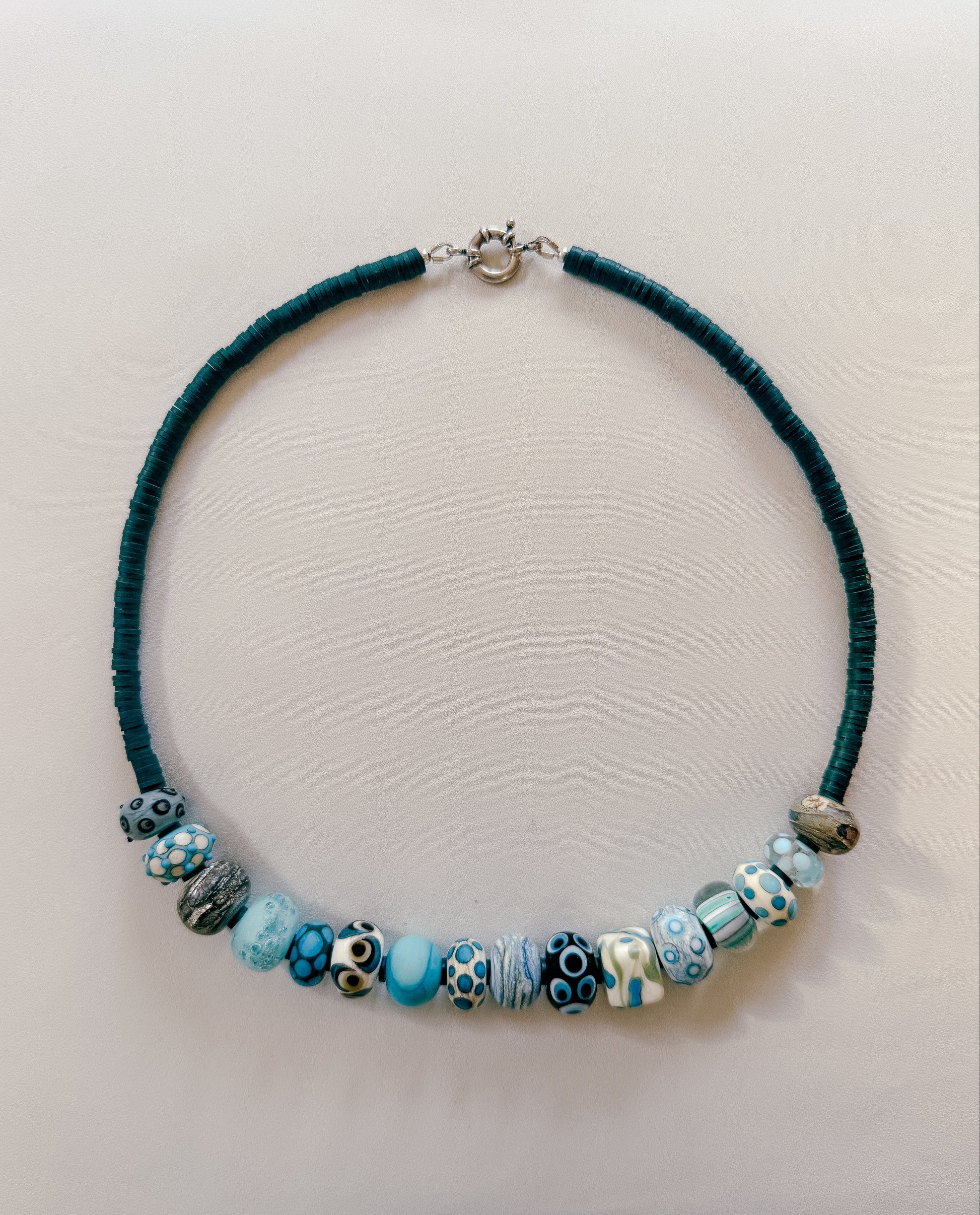Each necklace in the Artist’s Edit is composed of hand-made lampwork glass beads. Strung into colour stories pulled from intuition, memory, and mood.