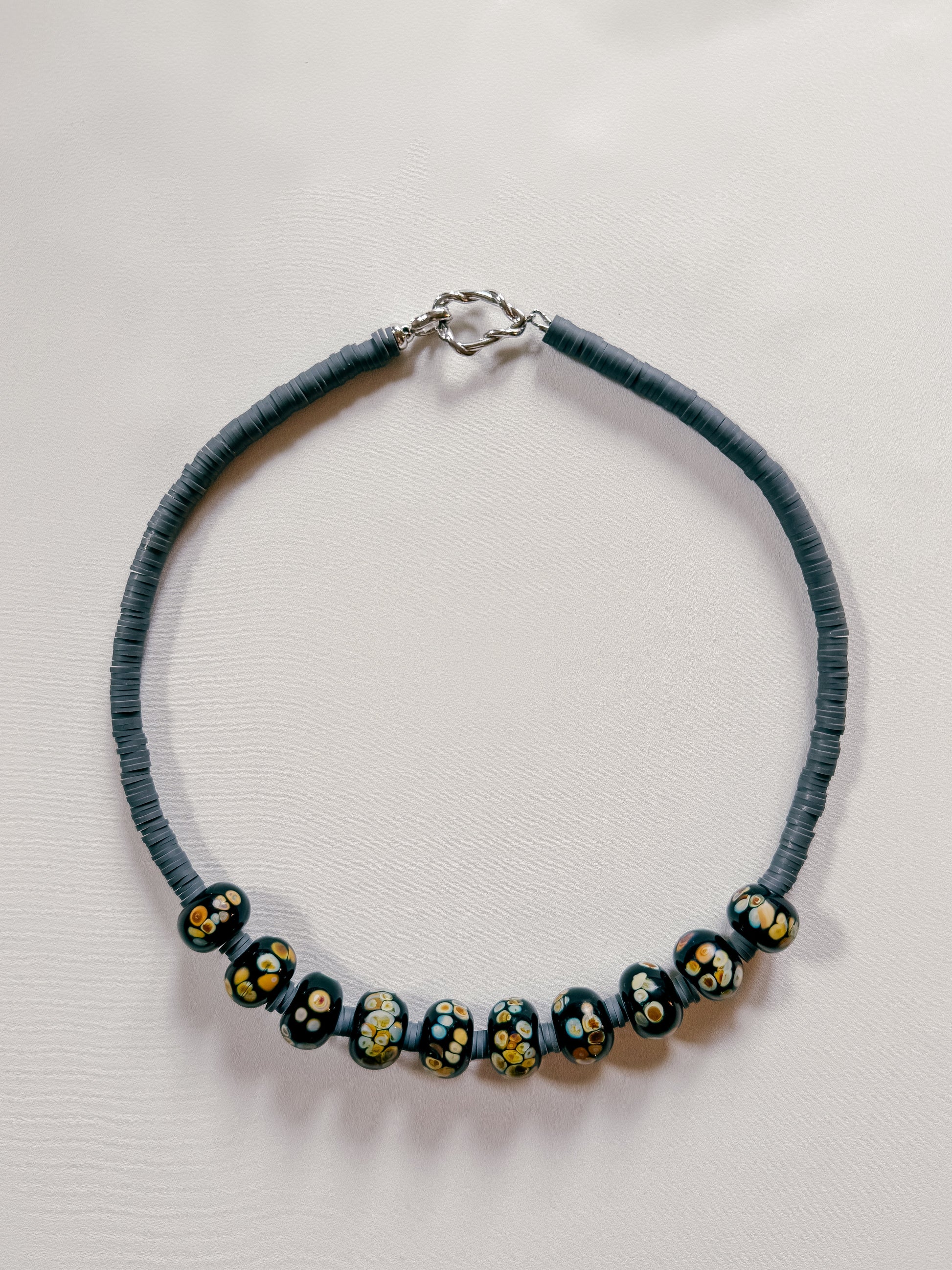 Finished with patinated findings and tone-on-tone heishi clay beads, weighty in the best way — part jewelry, part art, always part of your collection.